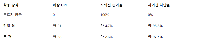 - 선크림과 병행 → 거의 완벽한 차단 (통과율 0.05% 수준)
